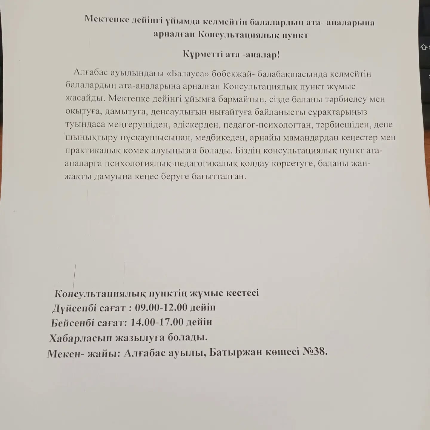 «Балауса» балабақшасында консультациялық пункт ашылды